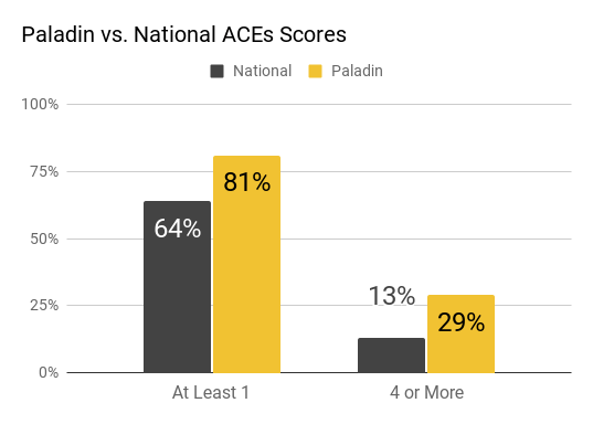 We seek to mitigate the harm caused by trauma and a high ACES score, because we have found that Paladin students, on average, have a higher ACES score than the national norm. In fact, they have an ACES score of 4 or greater at more than twice the frequency of the national norm.